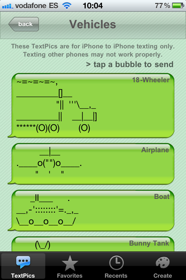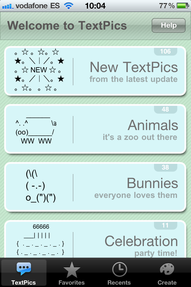 TextPics allows us to select many of these drawings, grouped by categories, in order to send them via SMS or simply use them in notes or emails.